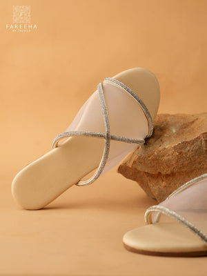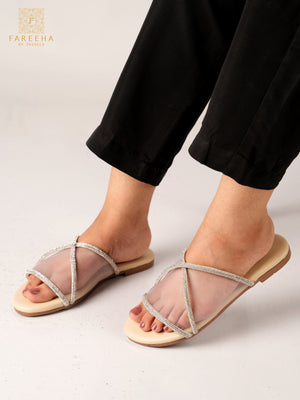 Beige fancy flats featuring a stylish fishnet design with shiny silver white mesh on top, crafted with a beige PU leather finish and a soft padded sole for all-day comfort.