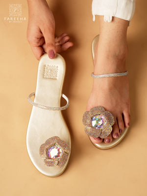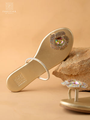 Toe-ring flats with a shiny brooch and elegant silver mesh design, crafted with a dust gold PU leather finish and a soft padded sole for all-day comfort.