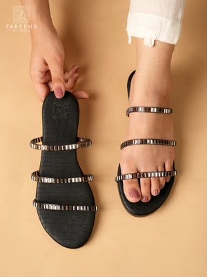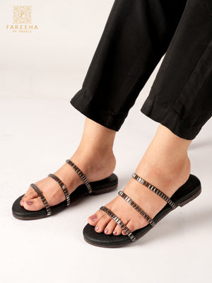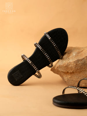 Elegant black flats featuring three black crystal transparent straps on the upper for a chic look, crafted with a black PU leather finish and a soft padded sole for all-day comfort.