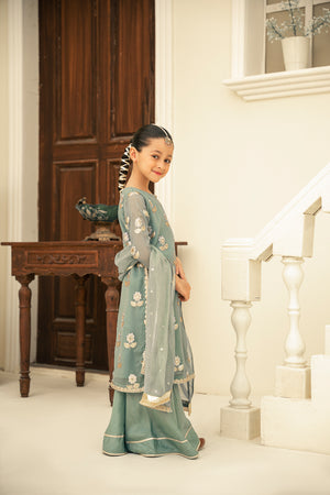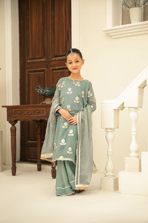 Stylish 3-piece ready-to-wear matching outfits for mother and daughter. Features an embroidered cotton raw silk shirt, cotton raw silk trousers, and a lightweight chiffon dupatta. Perfect for festive celebrations and family gatherings.