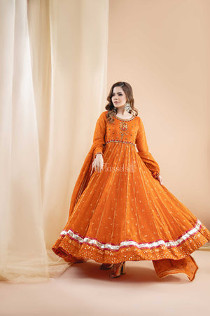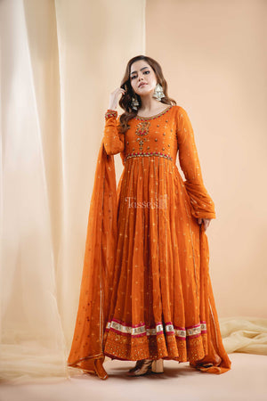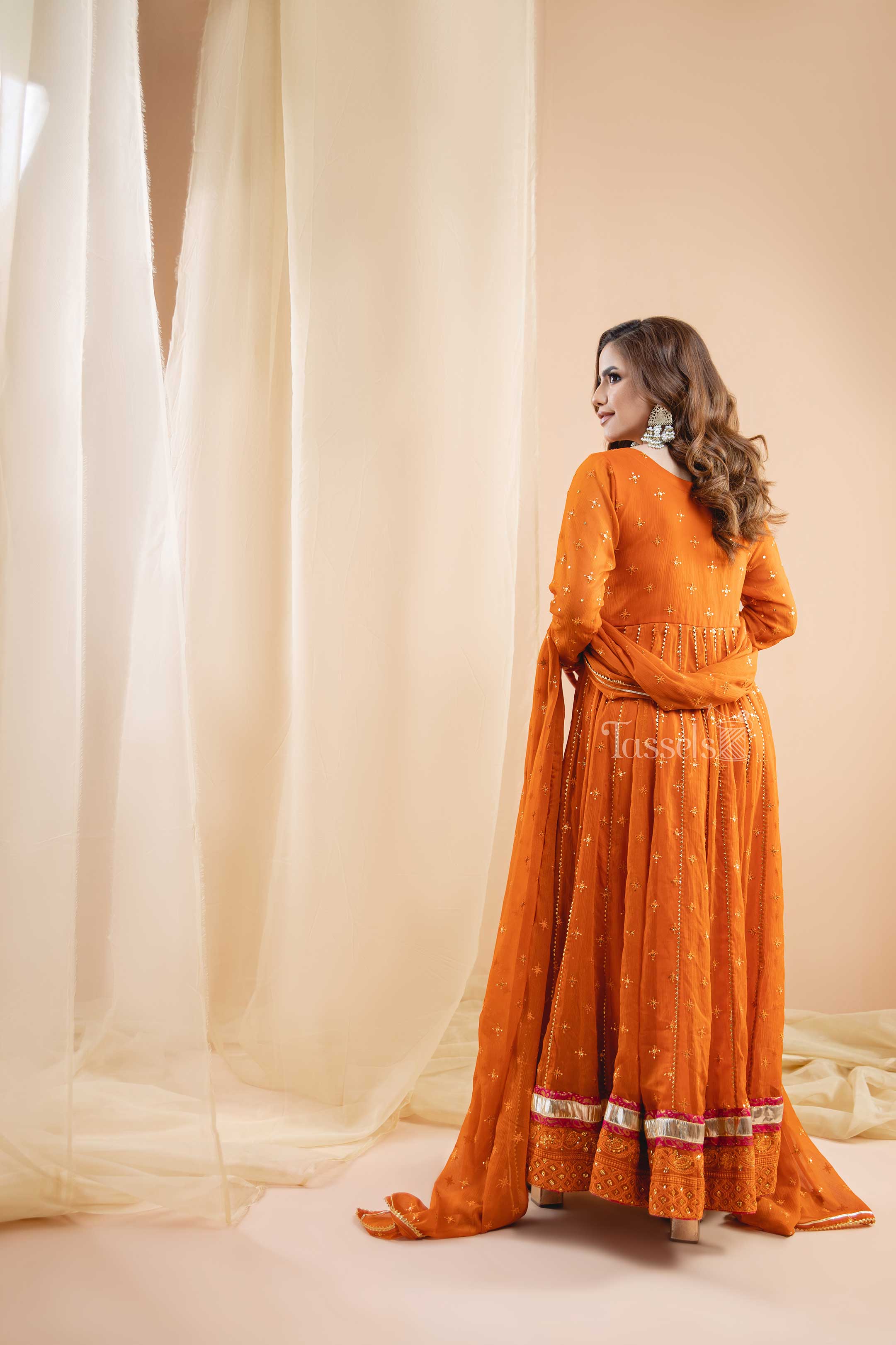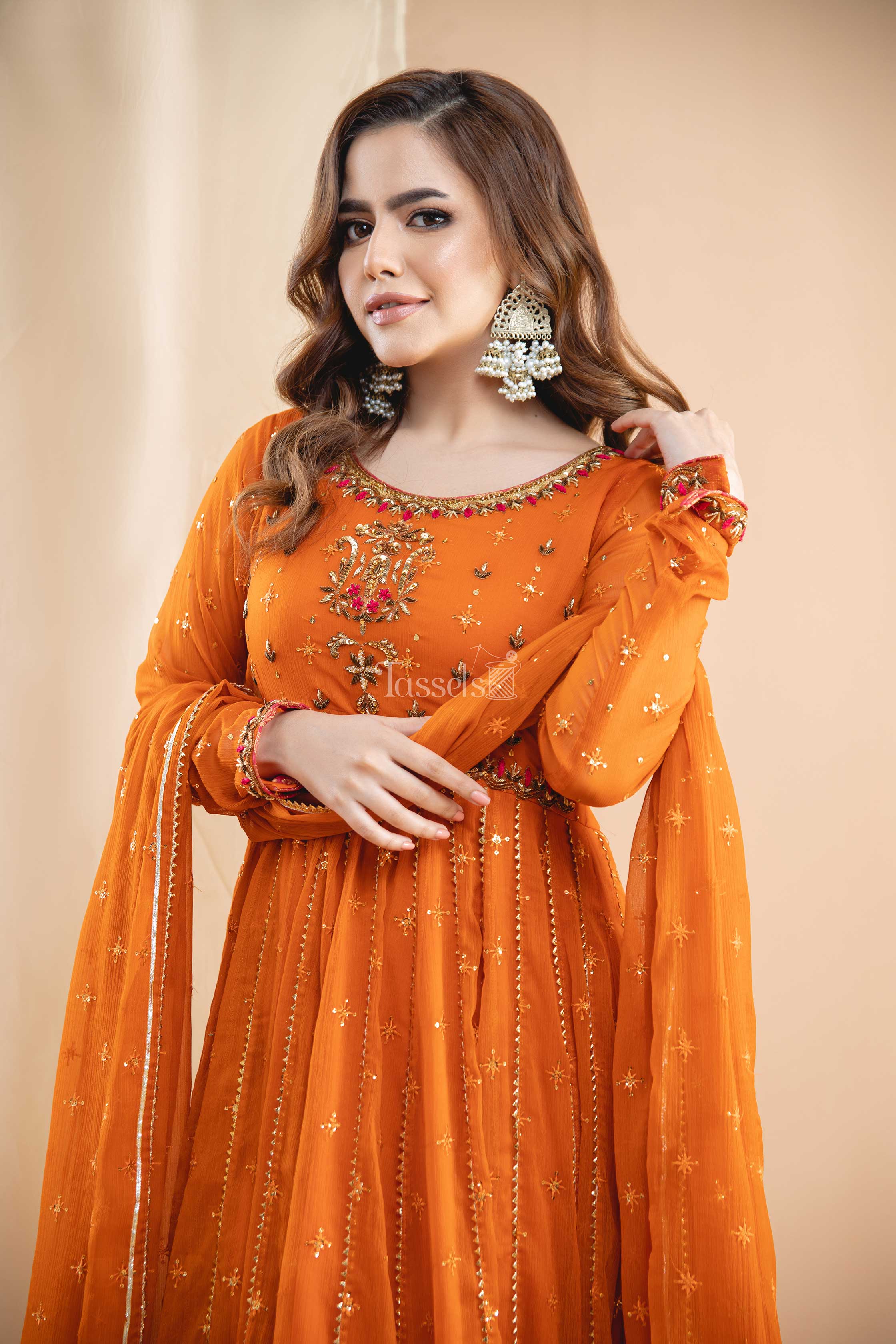 A classic narangi ensemble in sequins embroidered chiffon fabric along with zari and zardozi work on sleeves and neckline. To enhance the beauty of this outfit, there are embroidered borders and gota pati all over on the bottomline. It comes with straight gold jamawar pants and embroidered sequins chiffon dupatta to complete the festive look!