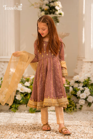 Jamini is a sumptuous attire with the captivating shades of purple and gold . An embroidered chiffon shirt and cotton raw silk bottom paired with a blooming gold net dupatta.