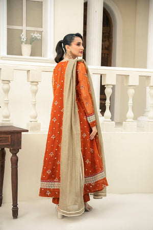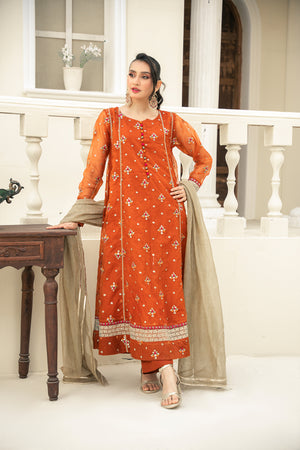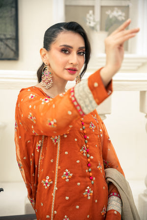 Exquisite zari multi-embroidered organza outfit with attached lining, paired with a coordinating dupatta and trousers. Perfect for weddings and festive celebrations.