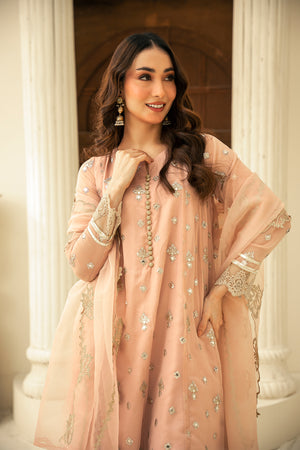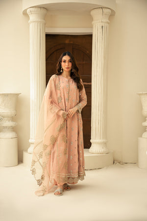 Elegant 3-piece outfit featuring an embroidered chiffon shirt with attached lining, paired with an embroidered organza dupatta and matching bottoms. Perfect for formal occasions and special celebrations.