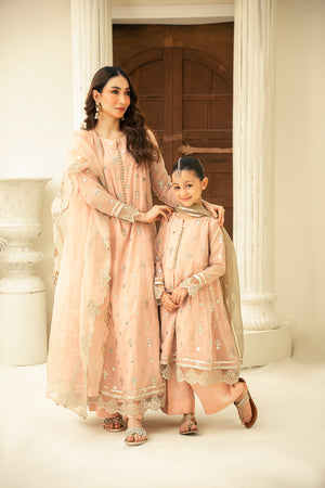 Elegant 3-piece outfit featuring an embroidered chiffon shirt with attached lining, paired with an embroidered organza dupatta and matching bottoms. Perfect for formal occasions and special celebrations.