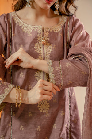 Elevate your wardrobe with our exquisite light lavender ensemble, crafted from luxurious self jacquard fabric. The ARI embroidery on the neckline and delicate sequins lace detailing on the sleeves, shirt borders, and center add a touch of elegance. Paired with a comfortable soft cotton trouser and a khadi net dupatta adorned with four-sided lace, this outfit is perfect for any sophisticated occasion.