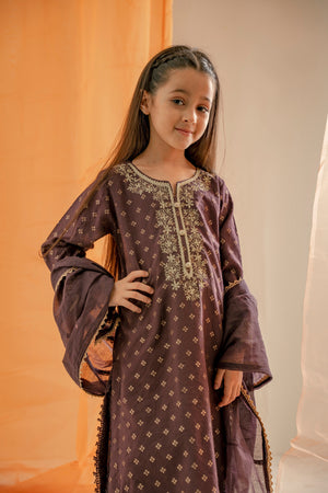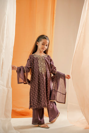 Make a statement with our stunning dark purple ensemble, crafted from elegant self-study fabric. Featuring intricate golden ARI embroidery on the neckline and sleeves, and adorned with GPO lace on the sleeves, this outfit exudes sophistication. Paired with a long cotton raw silk trouser and a matching dupatta, it's perfect for any special occasion.