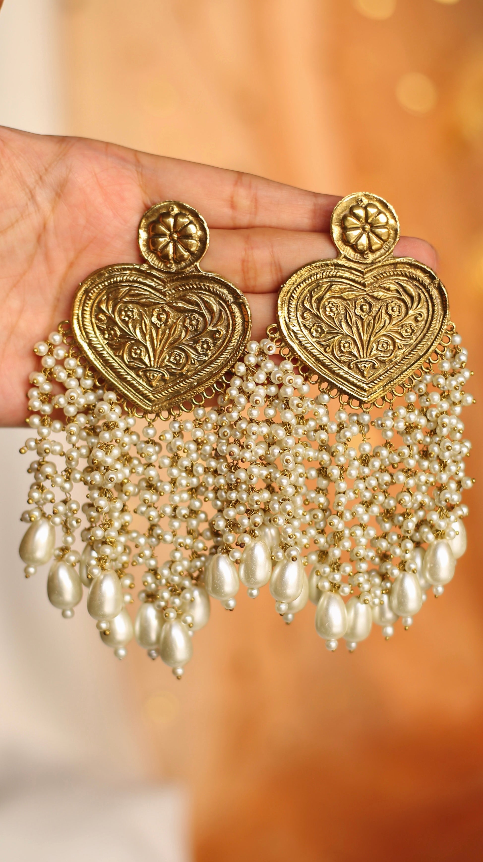 Worked in brass and adorned with handset pearls, these heart shaped handcarved danglers are definitely one of a kind. The silver polish gives hues of gold and copper, and has intricate detailing on top.