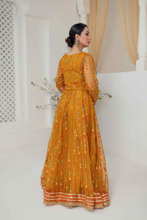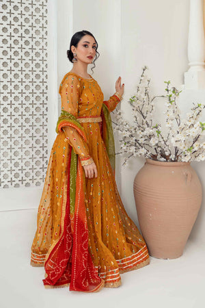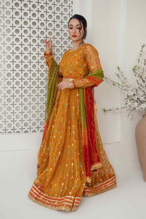 This striking ensemble features a mustard yellow embroidered shirt, adorned with intricate embroidery work. It is paired with a long, multi-embroidered lehenga, and the outfit is completed with a chundri dupatta, creating a vibrant and eye-catching look.