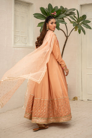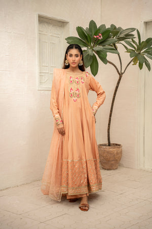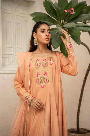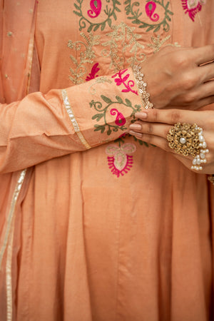 A sophisticated ensemble in rich raw silk, paired with a smooth cotton silk trouser and a graceful organza dupatta — ideal for special occasions.