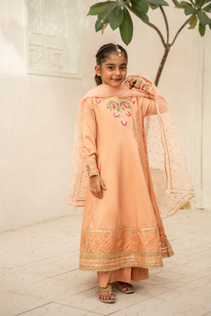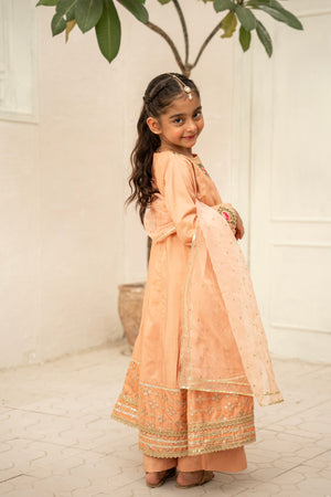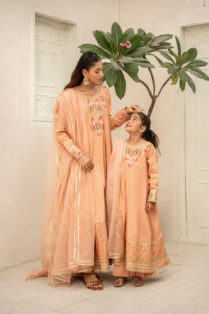 A sophisticated ensemble in rich raw silk, paired with a smooth cotton silk trouser and a graceful organza dupatta — ideal for special occasions.