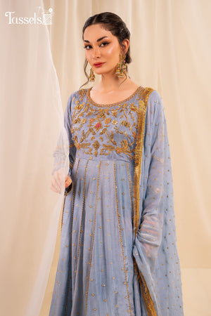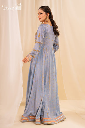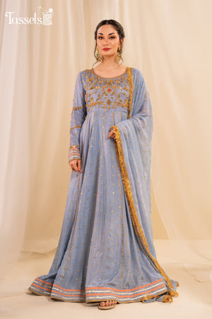 "pearl" is a sea blue raw silk peshwas featuring gold and peach embroidery Bodice, sleeves are embellished with pearls, gota flowers, dabka, crystals and zardozi work. It is paired with gold trousers and chiffon duaptta enhanced with gold squins and kiran finishings.