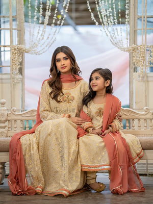 This soft and ethereal look is what you need in this Summer. Phool is an elegant zari net dress with an embroidery on the neckline, paired with a soft pink chiffon dupatta and raw silk pants.