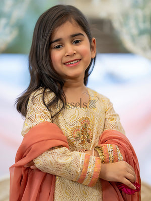 This soft and ethereal look is what you need in this Summer. Phool is an elegant zari net dress with an embroidery on the neckline, paired with a soft pink chiffon dupatta and raw silk pants.