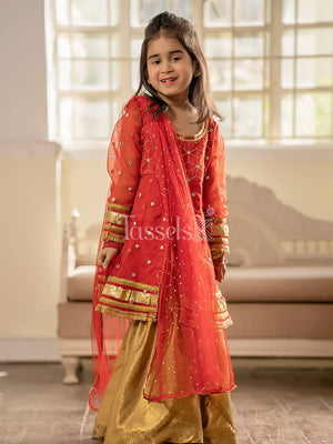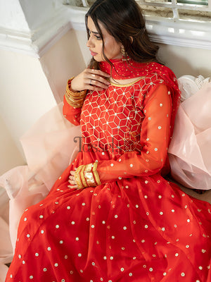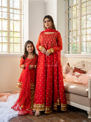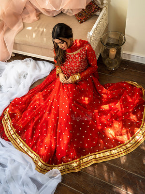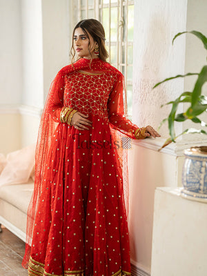 Be exclusive yet traditional this Eid with Rasan- a red embroidered organza shirt with the minimalistic gold gota work paired with net dupatta enticing the effortless glam.