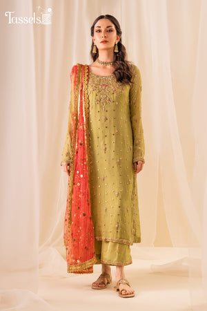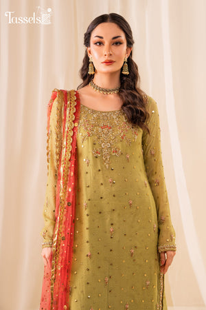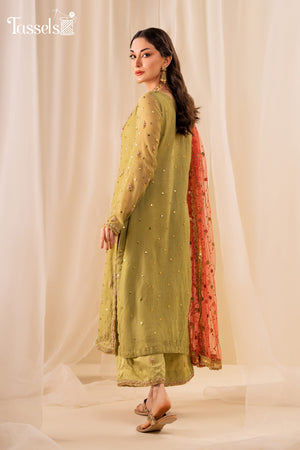 sabza is a heavy embroidered kamdani straight khaadi net shirt in light green color with gold and copper heavy handwork of kora ,dabka and kamdani. The shirt is paired with a matching kora dabka embroidered plazzo and a peachy pink heavy kamdani duppata with sequins. Contrasting finishing of gold lace are given to enhance the look of the dress.