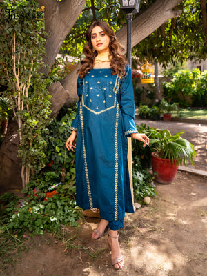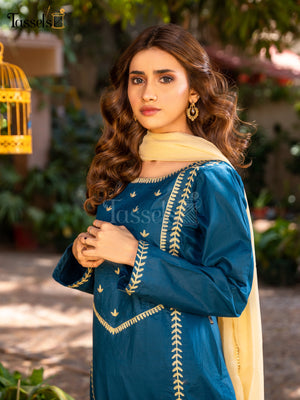 Classy gold embroidered cotton raw silk paired with chiffon duppata and pants.