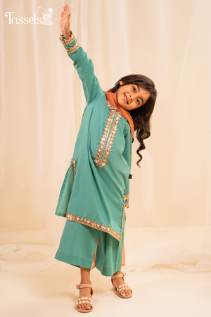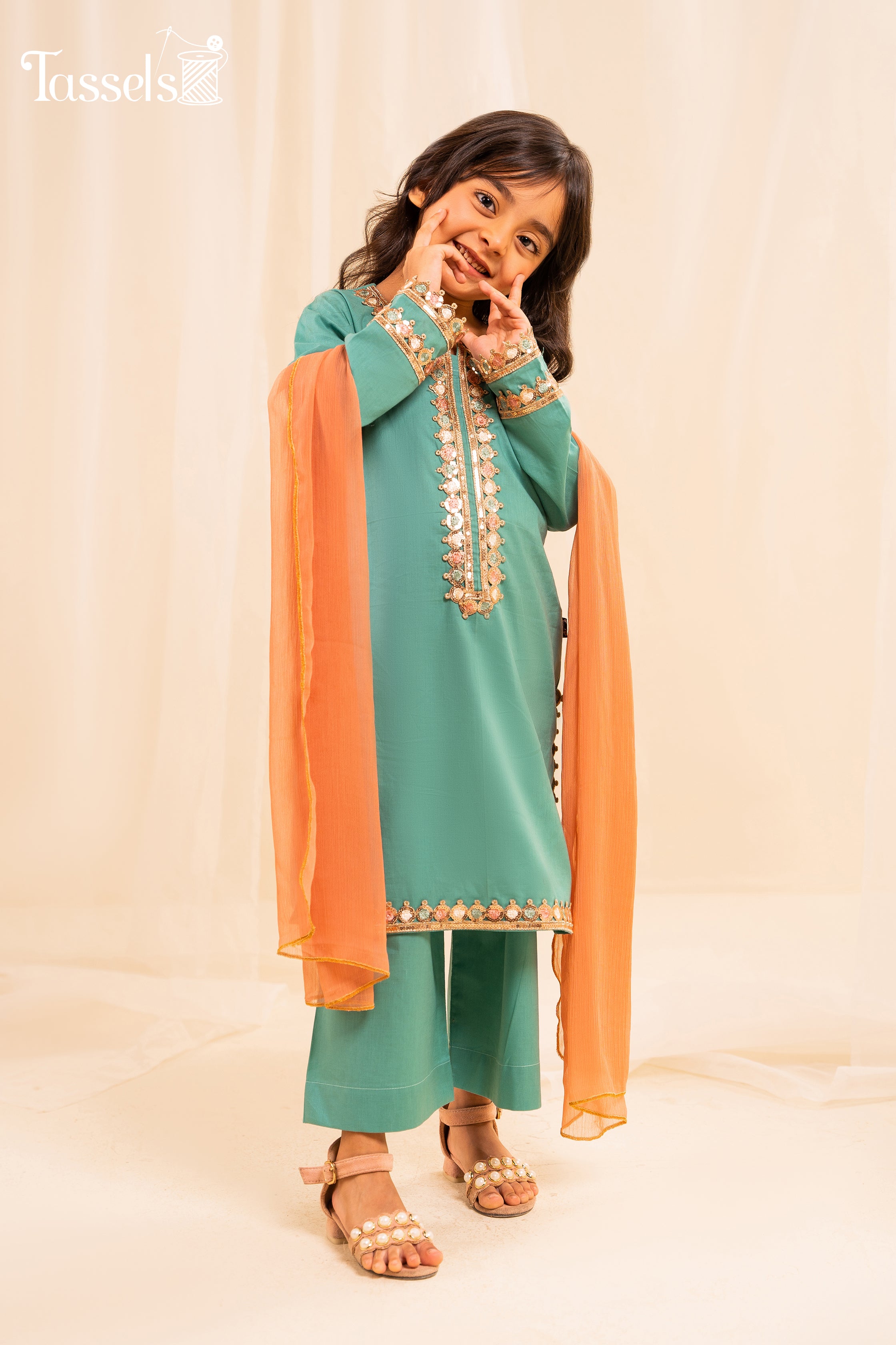 It a ready-to-wear mother-daughter duo in a graceful shade of sky blue, in self pure cotton lawn shirt and bottoms along with a chiffon dupatta. embroidered laces on neckline sleeves and bottom