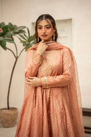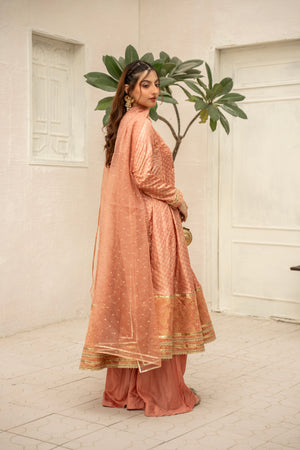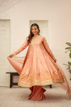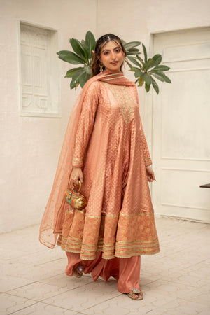 A graceful ensemble crafted from luxurious banarsi silk, paired with a smooth cotton silk trouser and a delicate organza dupatta — perfect for refined occasions.