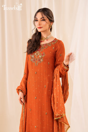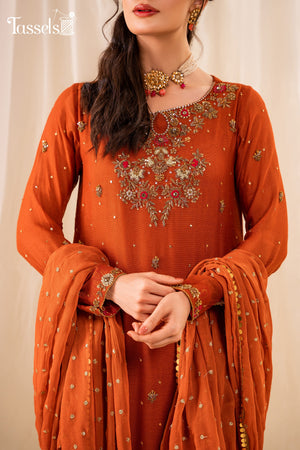 sophie is long khaadi net rust color straight shirt with an hand embellished heavy work on full shirt, neckline and sleeves .. intricately adorned with kora, dabka, zari, crystal work and contrasting pink and gold embroidery.