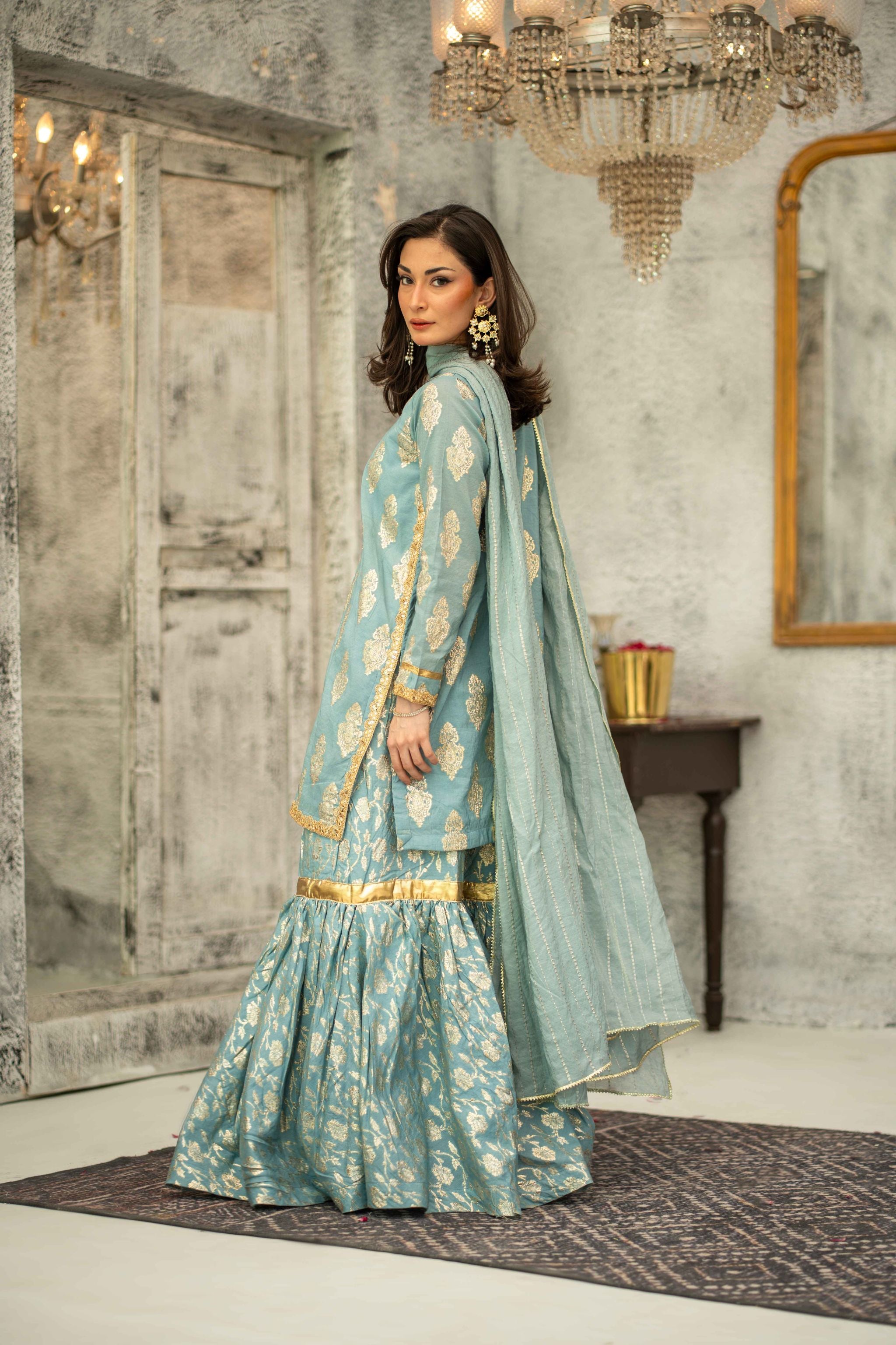 This sky blue outfit features a stunning self Zari Jacquard shirt paired with banarsi Jacquard trousers. It is detailed with gota work, buttons on the neckline, and intricate gharara-style embellishments, making it a ready-to-wear elegant ensemble perfect for festive or formal occasions