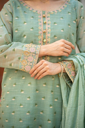 This elegant outfit features detailed embroidery on side borders, sleeve borders, and zari buttons. Paired with a Zari bell bottoms and a matching dupatta, it is a ready-to-wear ensemble perfect for festive or formal occasions.