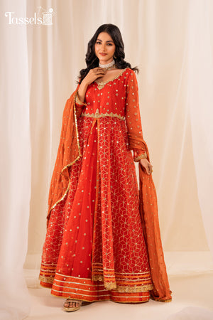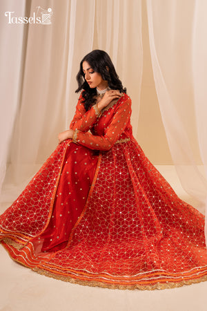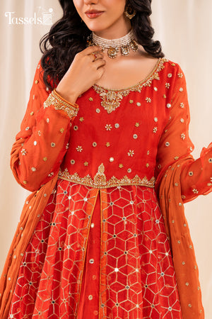 This Eid have the ultimate contemporary classic vibe you’ve been looking for with surkh - a zari embroidered soft oraganza long frock with detailed hand embroidery on the neckline paired with embroidered lehnga and chiffon embroidered duppata
