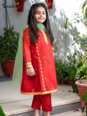 Red embroidered cotton raw silk paired with oraganza duppata and straight pants.