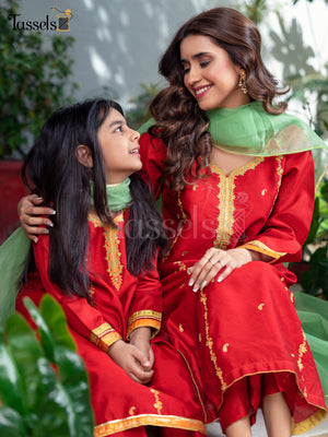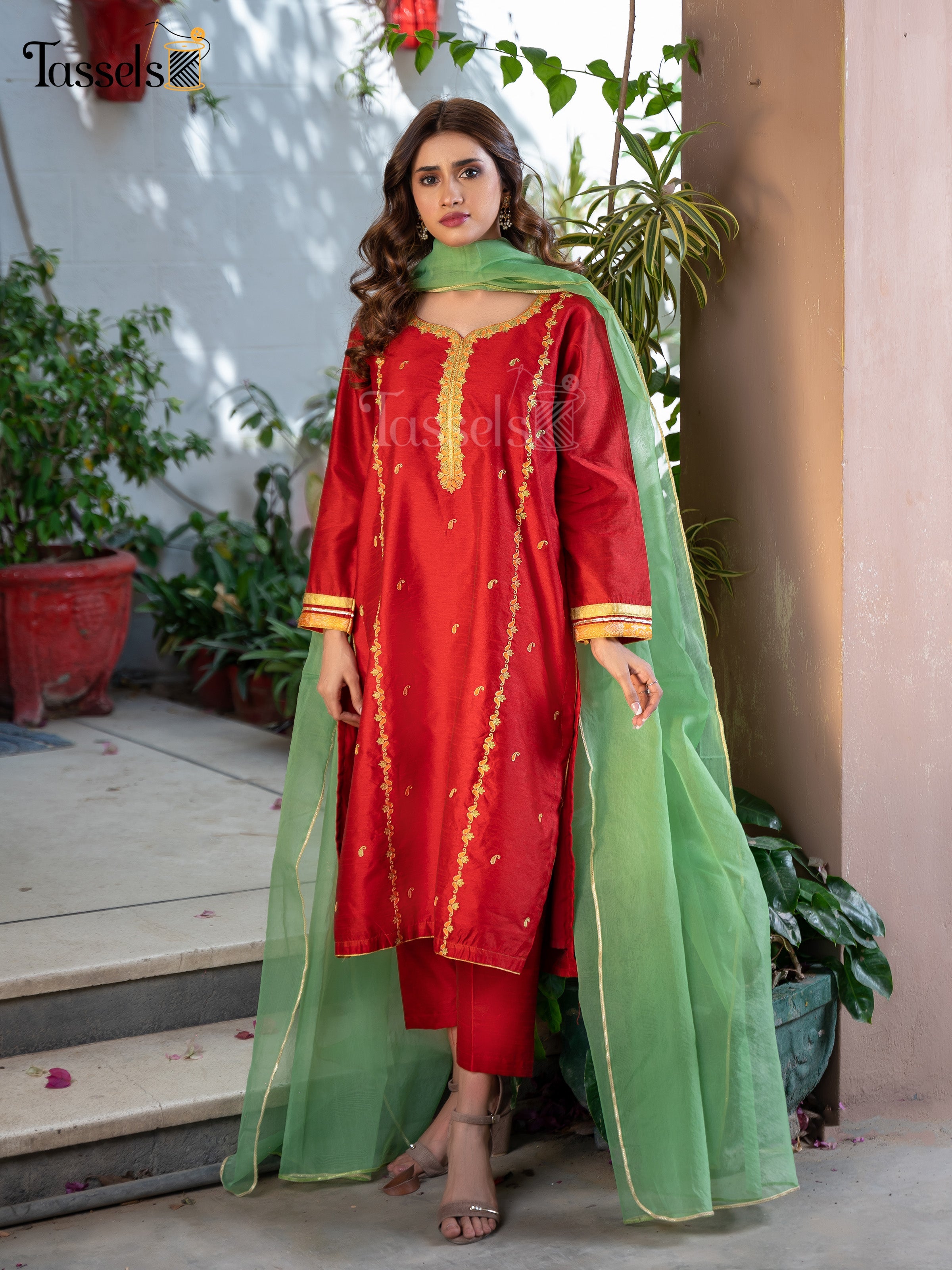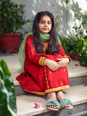 Red embroidered cotton raw silk paired with oraganza duppata and straight pants.