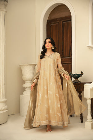 Sophisticated 3-piece ready-to-wear Angharkha, crafted from embroidered Khaadi net with an attached lining. Includes a matching Khaadi net dupatta and cotton raw silk trousers. A timeless choice for formal occasions.