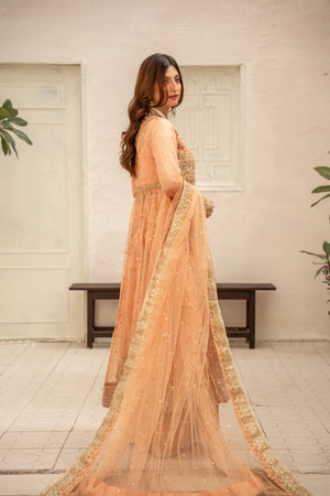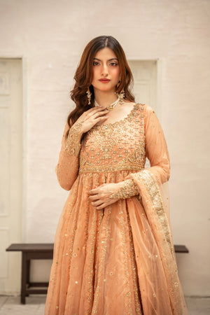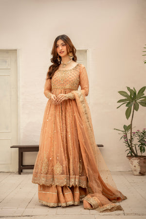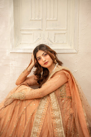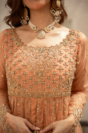 A luxurious pure organza frock with intricate heavy handwork, paired with a raw silk lehenga and a graceful kamdani organza dupatta — crafted for an unforgettable bridal or festive look.